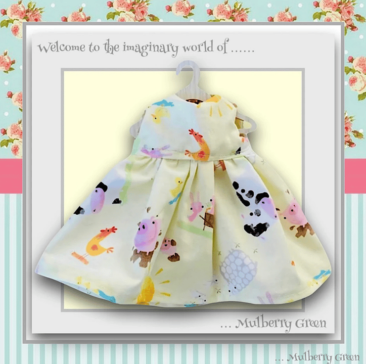 A pretty little lemon dress in a farm print, made to fit the Mulberry Green characters. The dress is made from best quality cotton and has a lined bodice and full skirt.