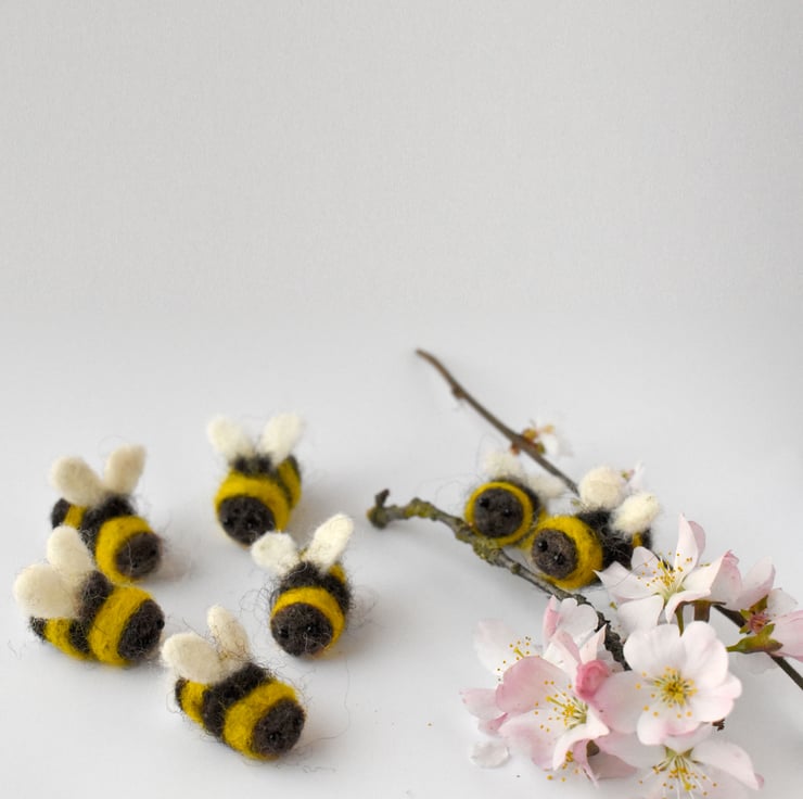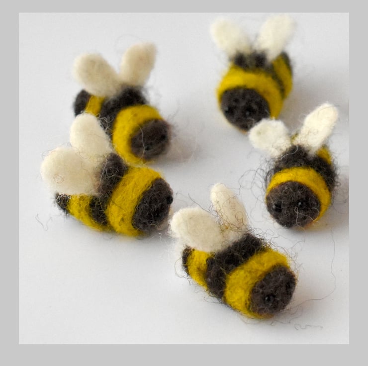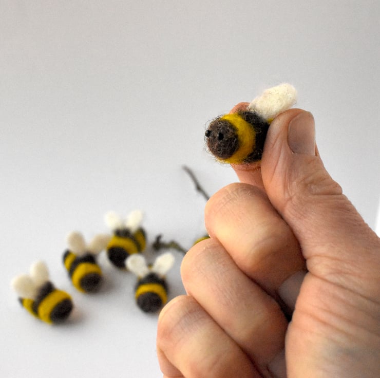 Needle felted, fuzzy bee with glass eyes. These little bees are full of character and are looking forward to the summer. Individual bee is approximately 2cm.