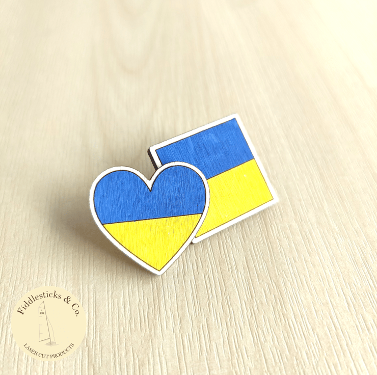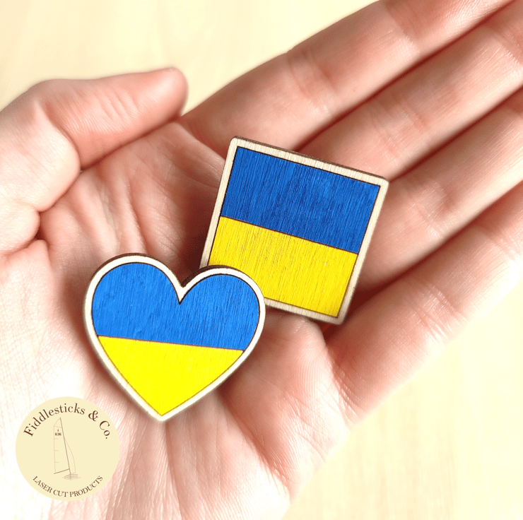 These wooden pin badges are laser cut and then hand painted with the Ukrainian flag colours.