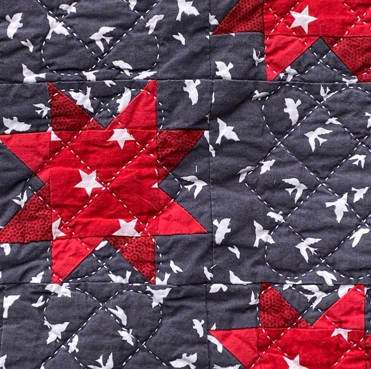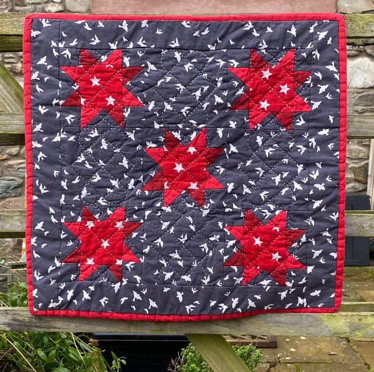 To add a little touch of Amish style to your walls, this miniature quilt was made for you! Using a traditional Amish Evening Star quilt design, with the strong red and black fabrics that are popular with the Amish and mixing that with one of my favourite swallows and red fabrics, this mini quilt was a joy to sew. I hand quilted this piece with white cotton perle thread.