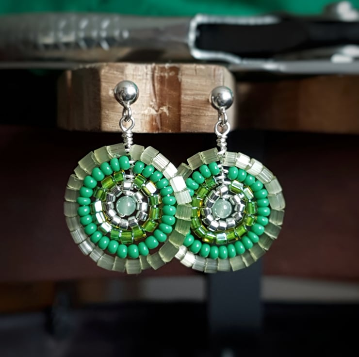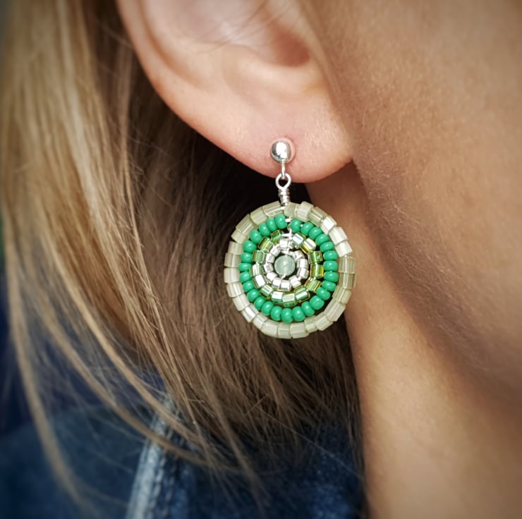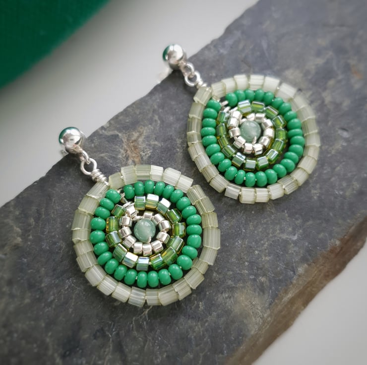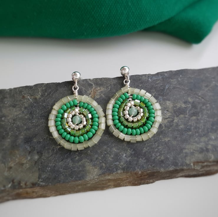 Each pair of these lovely earrings is made by hand. Circles of Japanese Miyuki glass beads, in different shades of green, surround a green aventurine gemstone sitting in the middle. Each peacock round dangles off a sterling silver 4mm ball stud, with a butterfly back.