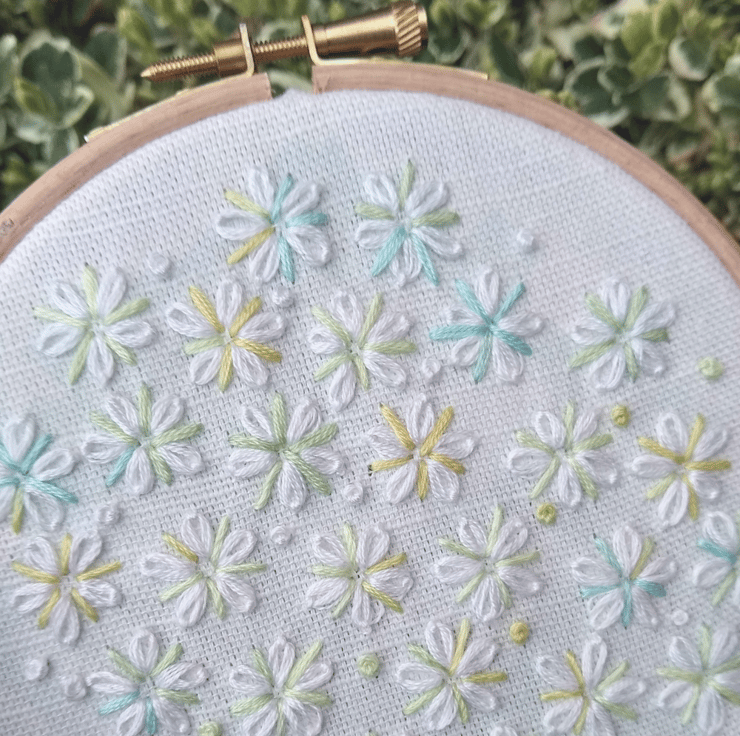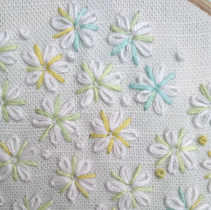 The embroidery kit is a subtle white and pastels design, using three simple embroidery stitches (lazy daisy, straight stitch and french knots) to create a picture-perfect piece of embroidery hoop art.