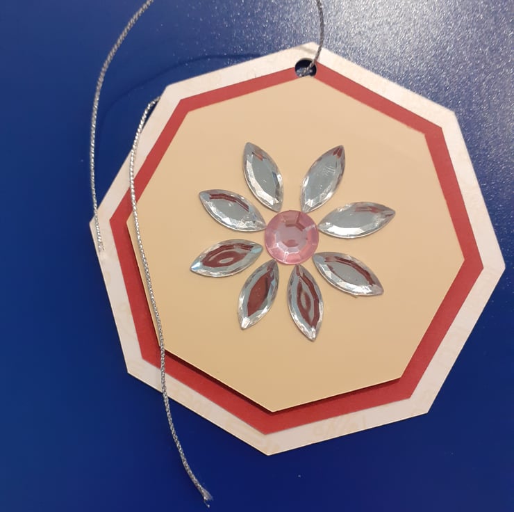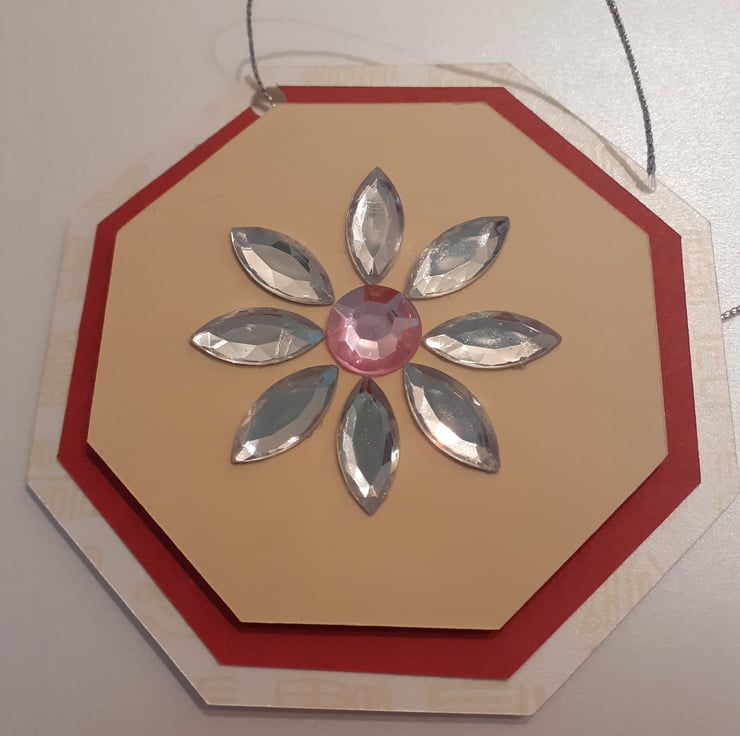 Next comes a deep red octogan which I have mounted foam sticky pads to start the 3d effect. On top of the red is a cream octogan which hosts a selections of clear and a pink gem shaped in to a gorgeous eye catching flower.