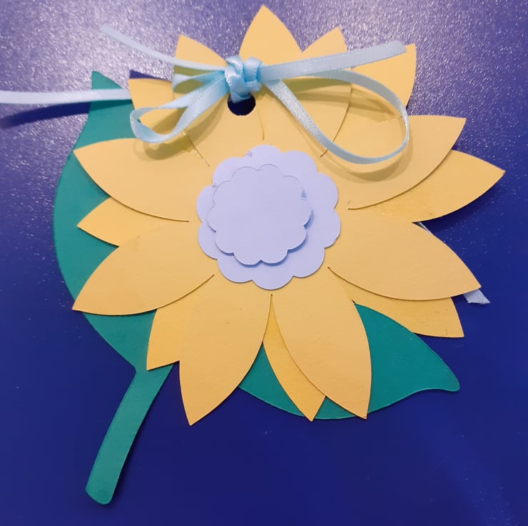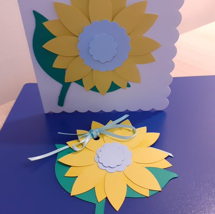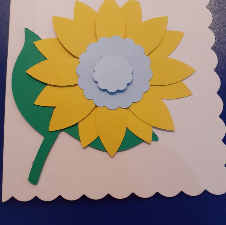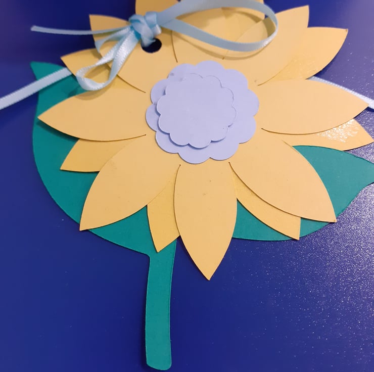 The card roughly measures 12.5cm by 12.5cm. For this card I have designed a 3d sunflower. For the flower head I have the traditional yellow petals but I have used a blue high quality card for the center of the flower. Peeping from behind the flower head is a green stork and green leaves. The flower is showcased on white card with fancy edging. The inside is left blank to give the sender the opportunity to write their own verse. The card and gift tag are suitable for any occasion including mothers day, birthday, anniversary etc.