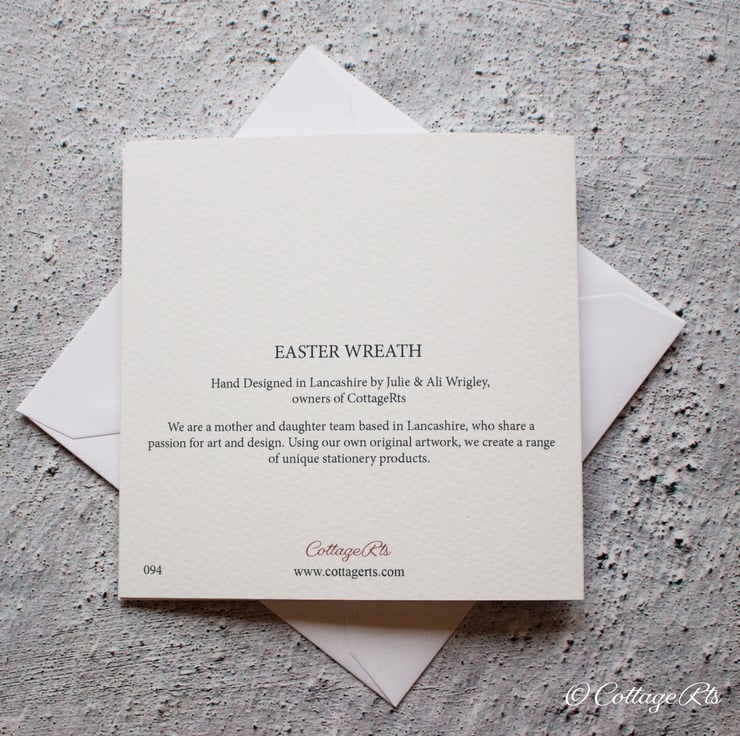 This spring wreath design has been created using our own original watercolour paintings and prints. It has then been digitally printed on to heavy card stock.