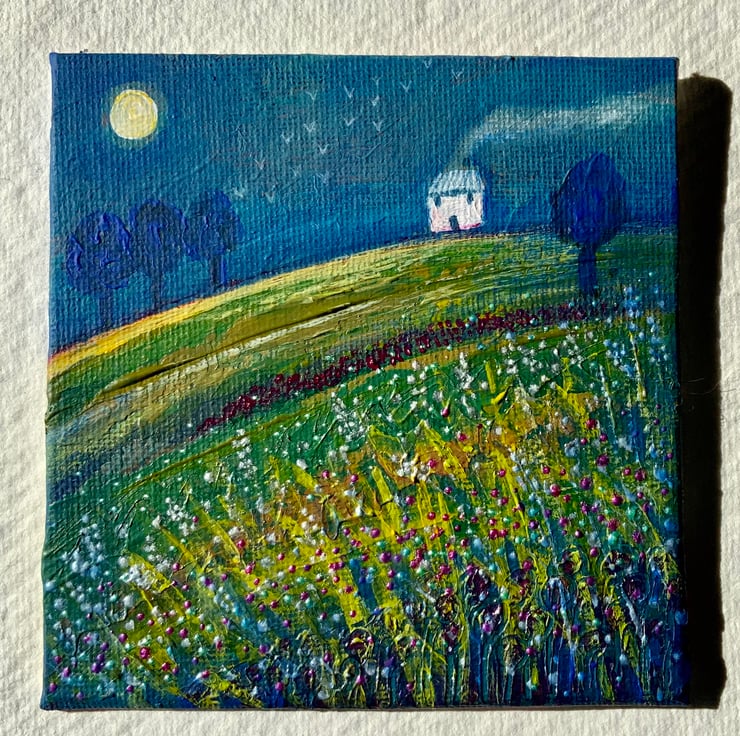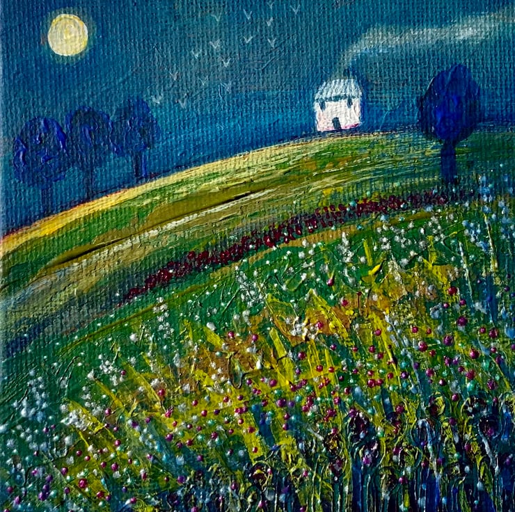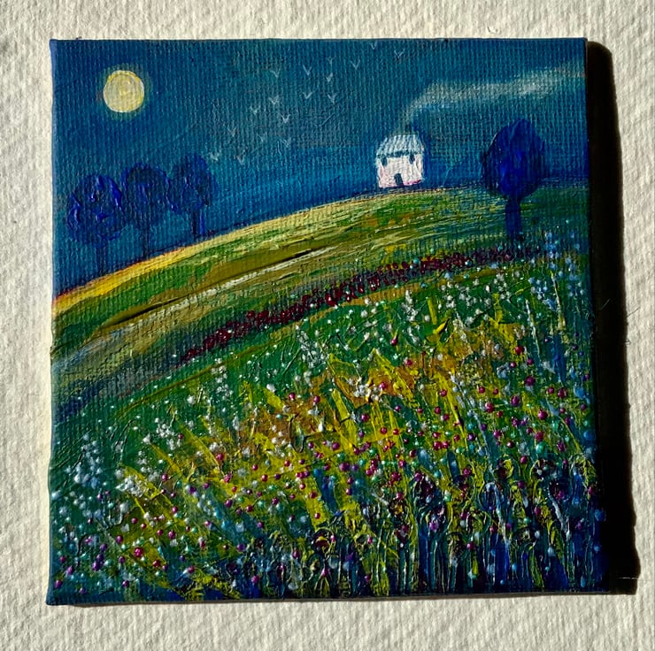 An original acrylic painted on a 10x10cm canvas board which is unmounted and unframed to allow you to choose a frame in your own style. These little canvases could also be displayed on a shelf or mantelpiece. It features a peaceful moonlit meadow complete with a little cottage.