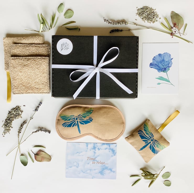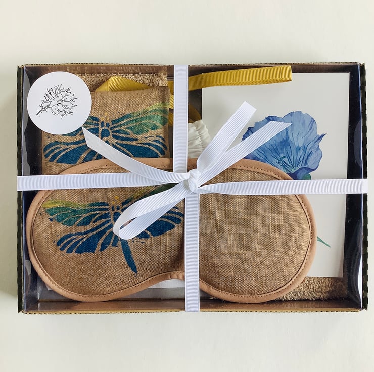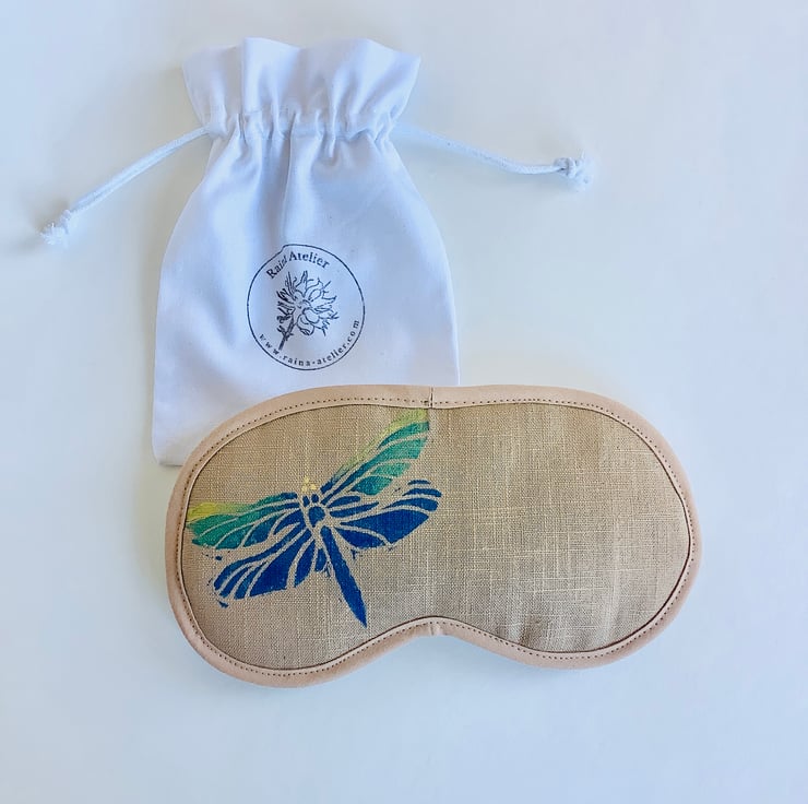 - Lavender Infused eye sleep mask hand printed with an original linocut designs using eco friendly inks on to natural 100% linen with protective white organic cotton bag