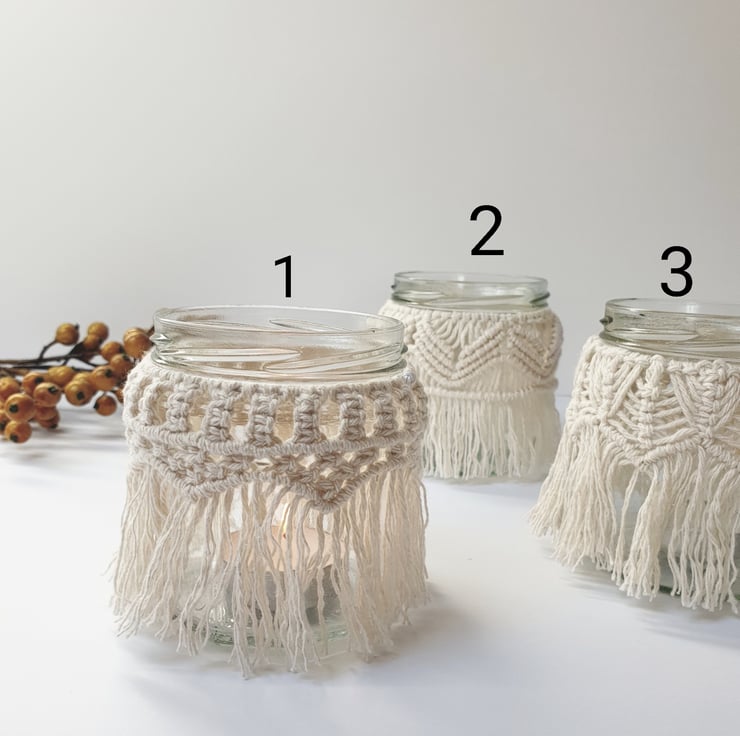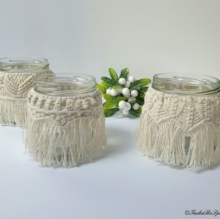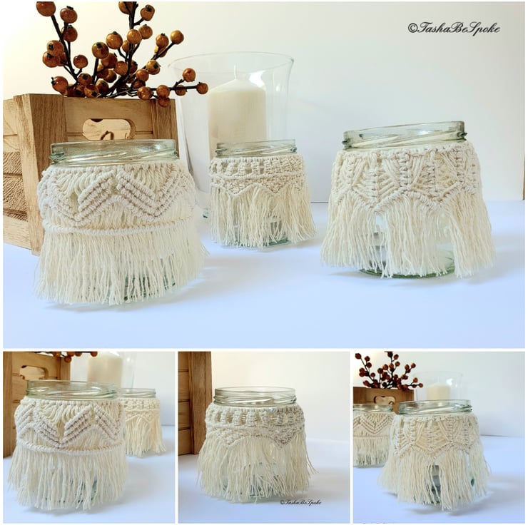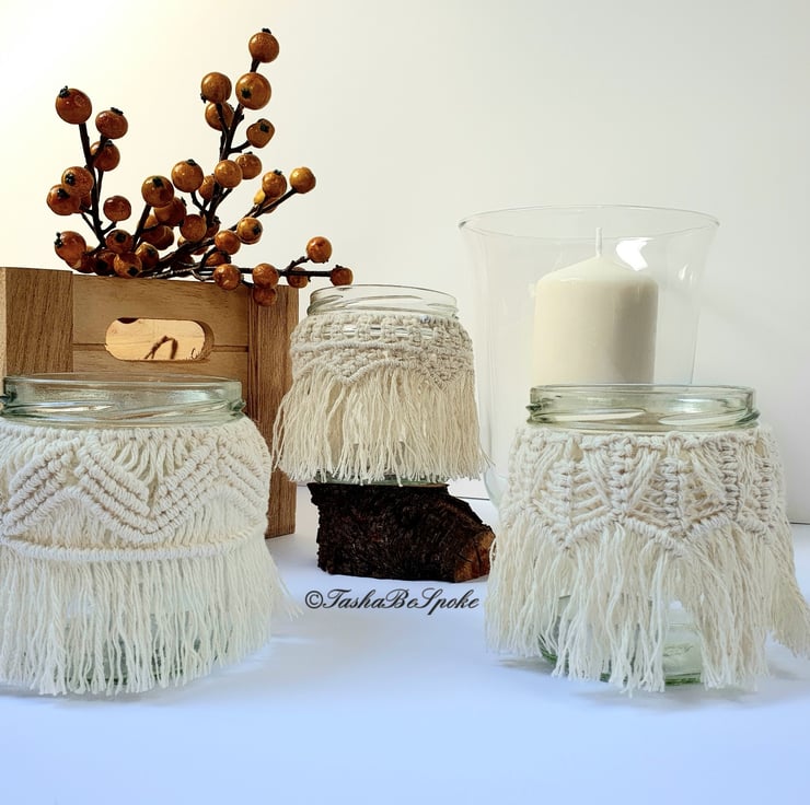 Handmade macrame jars covers available in 3 bohemian patterns. These lovely Macrame jars can be used as vases, candle holders, storage jars or beautiful home decor.