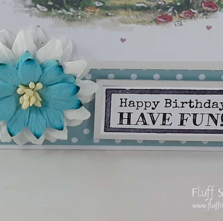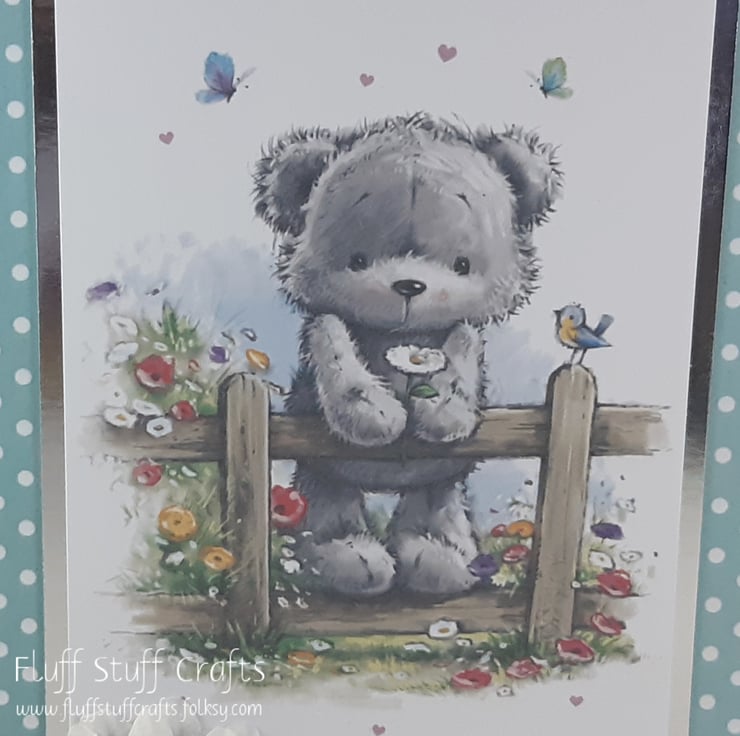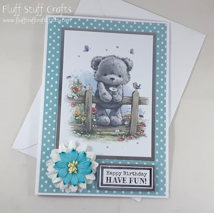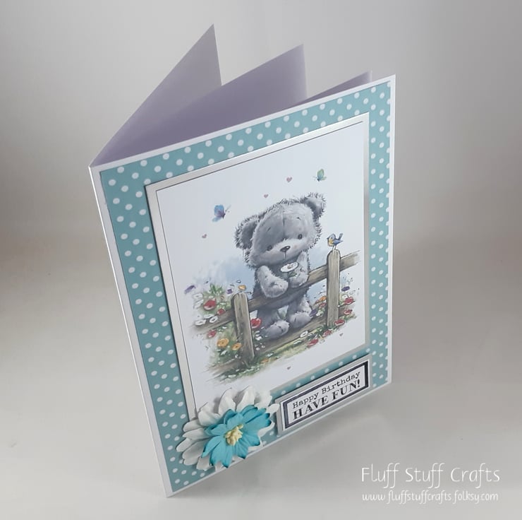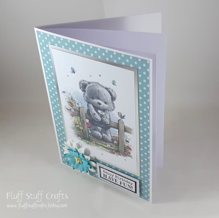 Handmade birthday card featuring a cute image of a bear, leaning over a fence, surrounded by flowers, butterflies and a little bird. The image and sentiment 'Happy Birthday HAVE FUN!' have been mounted onto silver mirri card, over a teal and white polka dot background. The card has been embellished with a coordinating flower cluster.