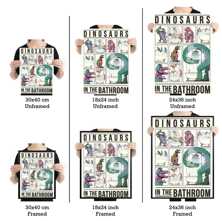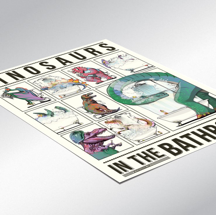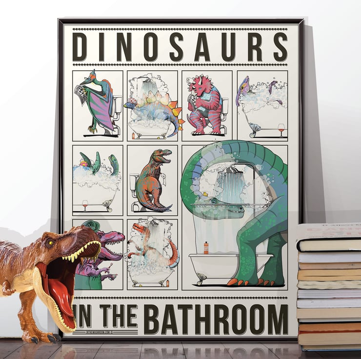 Children's bathroom dinosaurs poster for your bathroom. It shows all the favourites using the bathroom in one way or another, diplodocus, parasaurolophus, plesiosaur, pterodactyl, stegosaurus, triceratops, tyrannosaurus and the velociraptor.