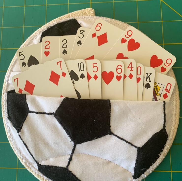 A card holder for up to 13 playing cards, ideal for Bridge, Canasta or UNO. Approximately 6 1/2” (16cms) and 100% cotton.