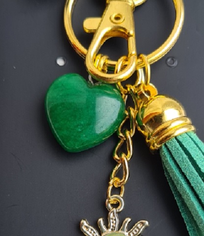 Key ring/bag charm length is approx 10cm long from the top of the swivel clasp to the bottom of the Sun charm. Sun charm is a light gold tone with a Light Green centre, approx 20mm x 18mm. Heart charm is a Green Gemstone bead approx 15mm x 15mm, and tassel is Green suede leather and acrylic.