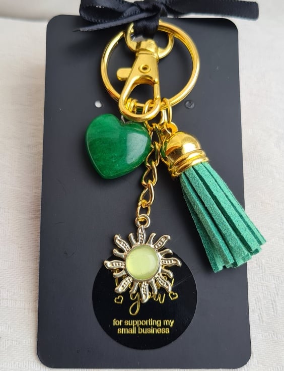 Brighter Days Keyring 5 - Light Green Sun, Green Tassel, Green Gemstone Heart.