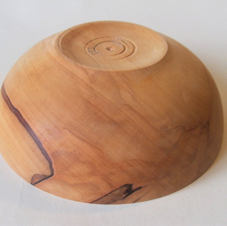 Spalted Horse Chestnut bowl, 123 x 45mm. A nice small size Spalted Horse Chestnut bowl with a food safe finish. It has a nice rounded curve shape and an in-turned rim. It has a pale colour covered with light swirling streaks in pinkish hues, with dark streaks to one side, a very nice looking piece. It has a food safe finish and would make a nice food/nibbles bowl or just a nice decoration.