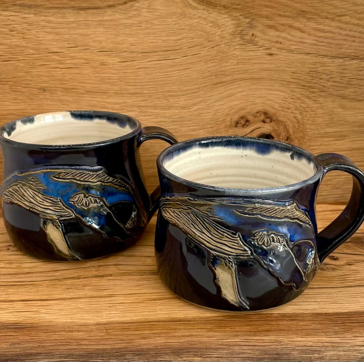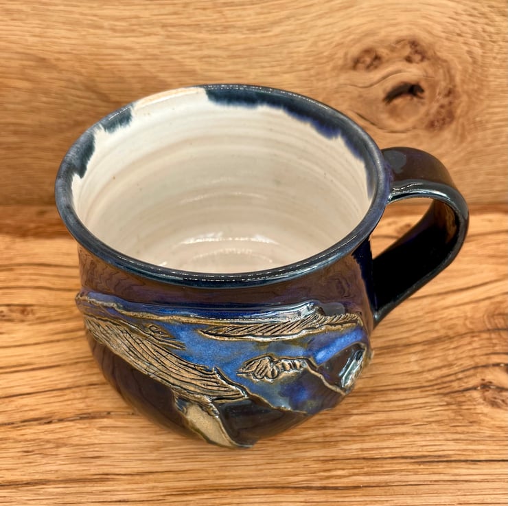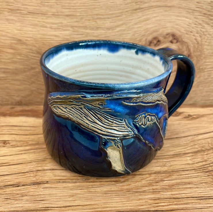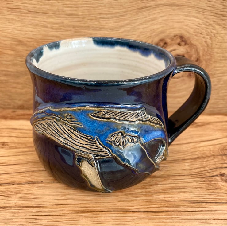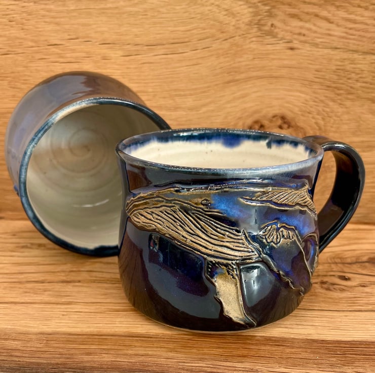 Fired to 1260 degrees with a gorgeous midnight blue glaze to enhance the majestic humpback whale. The whale has been hand carved in relief and glazed to evoke swimming through the ocean. The inner glaze is a vintage white to enhance the cups throwing rings.
