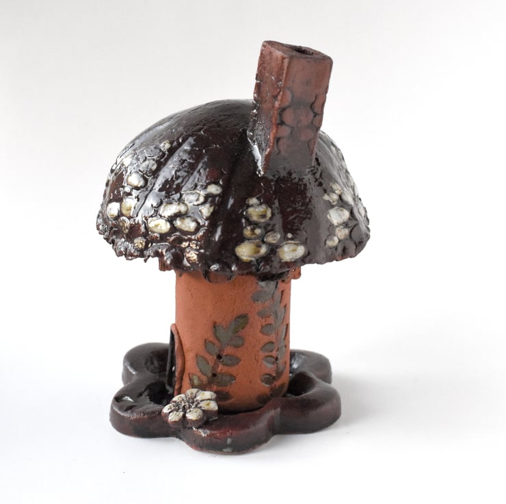 This magical toadstool incense burner was hand built with terracotta clay and hand glazed to ensure each toadstool is unique. This one has a rich brown tone with some details hand glazed in fern green and white