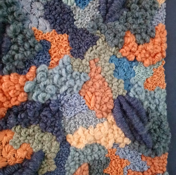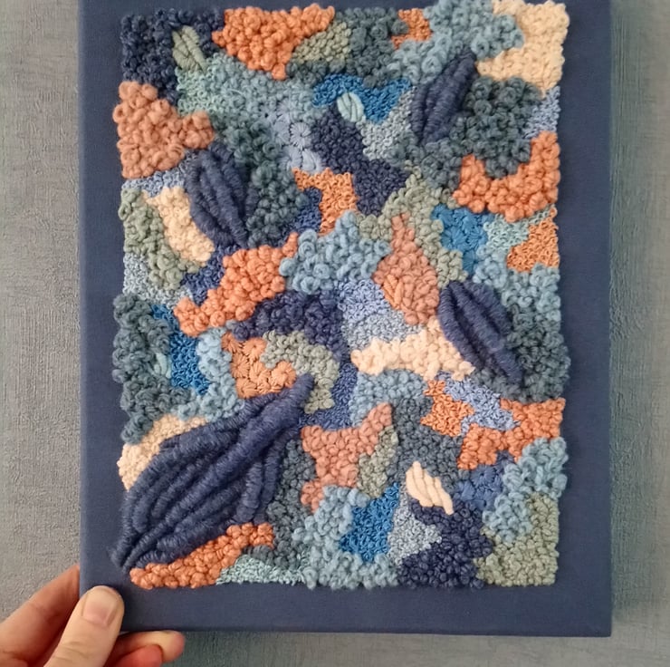 Lagoon landscapes a one of a kind piece of home decor art measuring 10 inch by 8 inch. Embroidery thread, yarn and beads have been hand sewn onto a blue fabric which has then been stretched across a wooden frame to create a unique piece of canvas art. This piece is a perfect addition to any home.