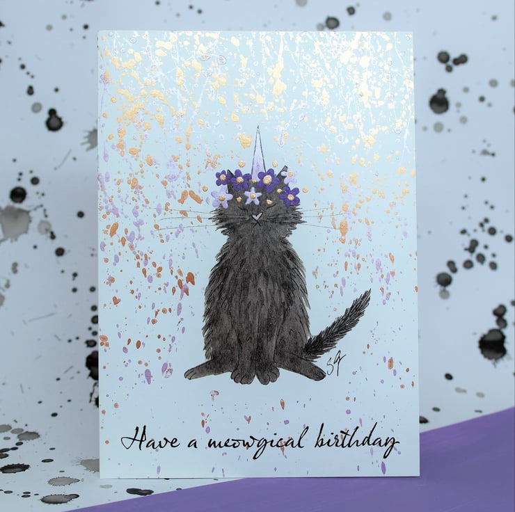 Meowgical caticorn birthday card, printed with hand finished mica powder details