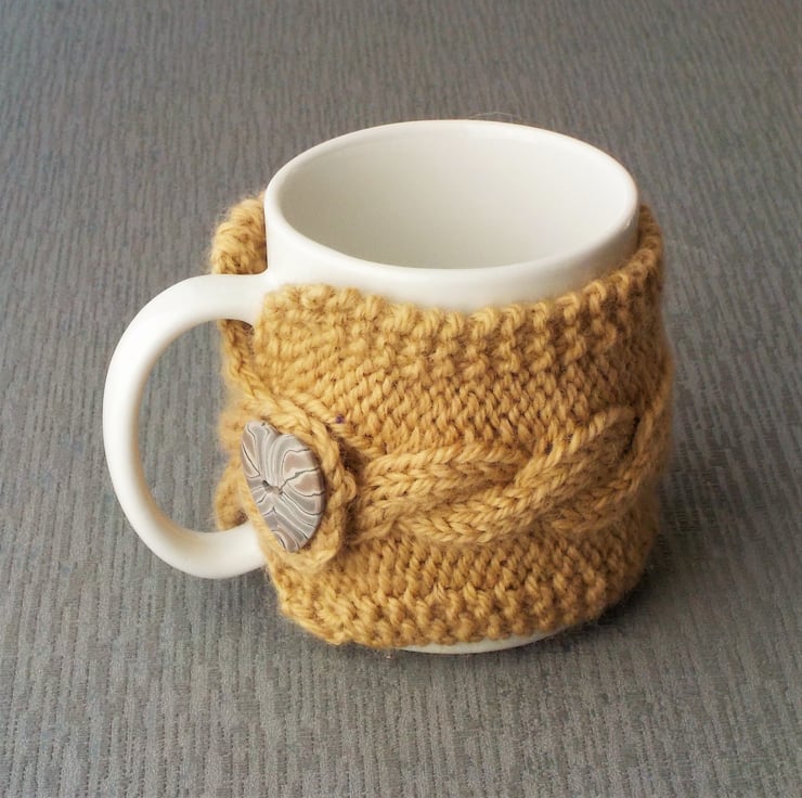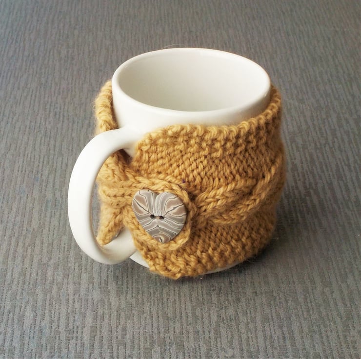 Here is a lovely gift for those who use a mug rather than a teacup. A mug cosy totally handmade here in the UK. The gorgeous pure British wool is a soft Blue-faced Leicester wool in a bright fawn. I have used it to knit a cable design mug cosy. The cosy fastens through the handle of your mug with a handmade heart-shaped button, made by another British crafter.