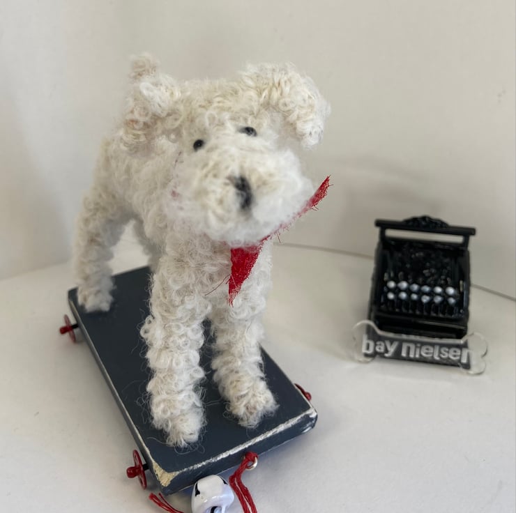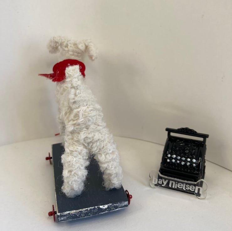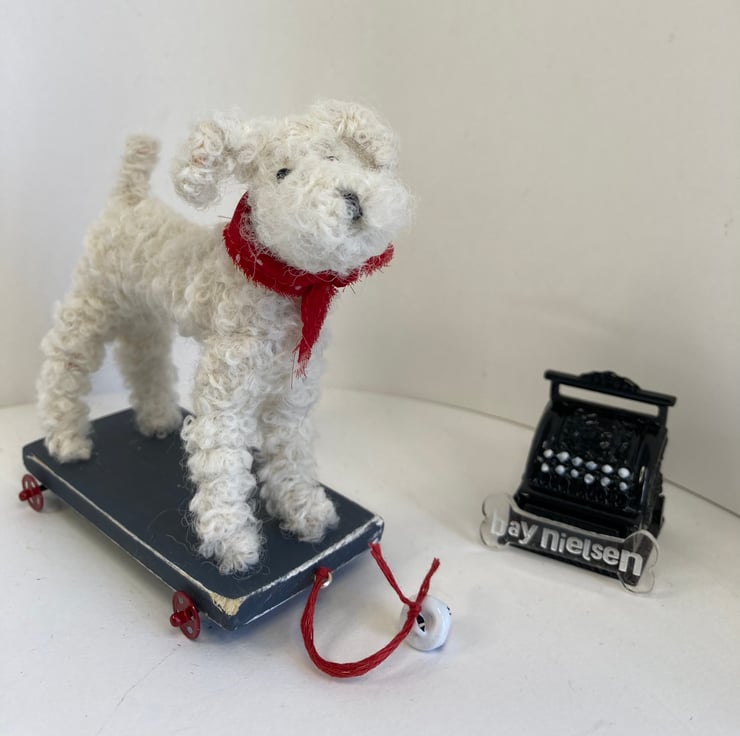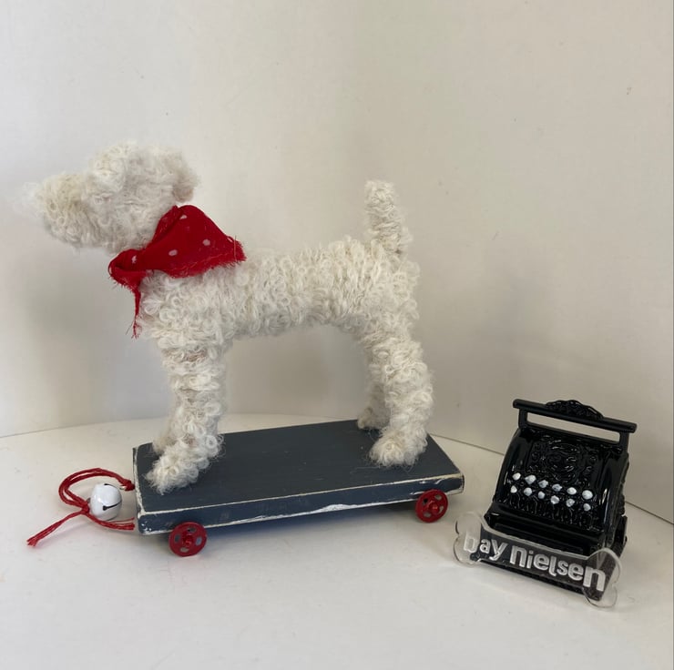 OOAK sculptured miniature dog on a pull along wooden trolley with wheels. All my animals are hand finished with eyes and noses and, if needed, wool whiskers! The wheels are for decorative purposes only and do not turn.