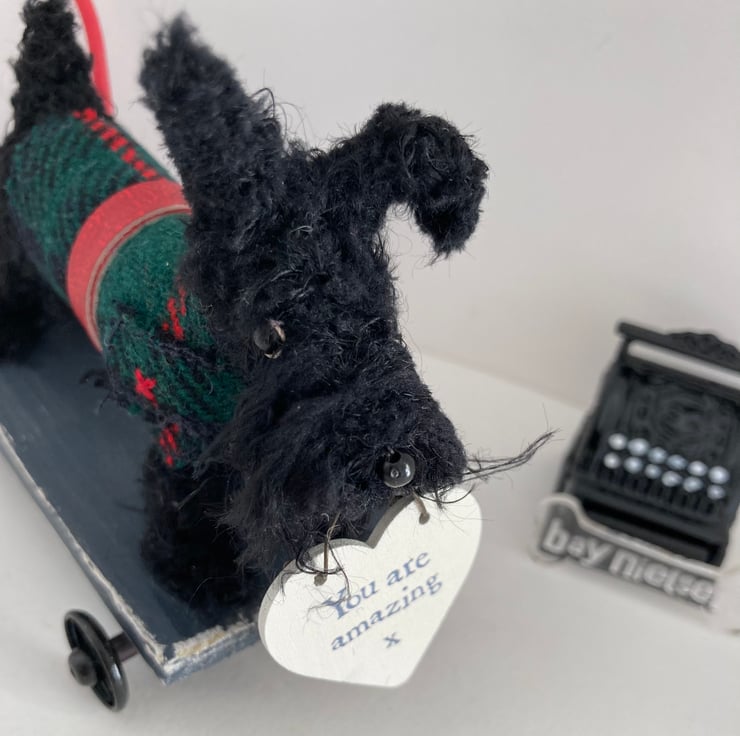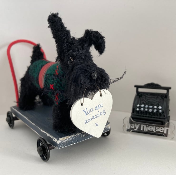 OOAK sculptured miniature dog on a pull along wooden trolley with wheels. All my animals are hand finished with eyes and noses and, if needed, wool whiskers! The wheels are for decorative purposes only and do not turn.