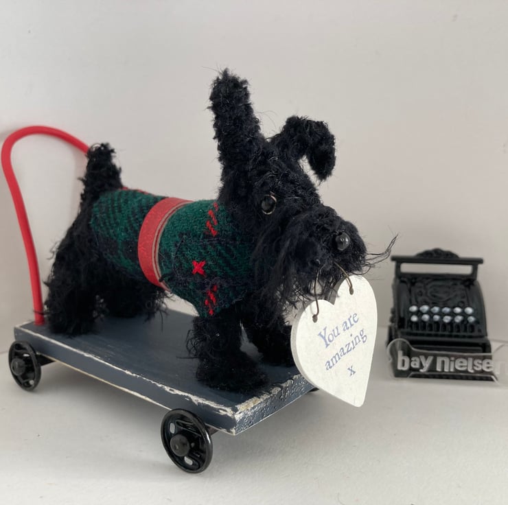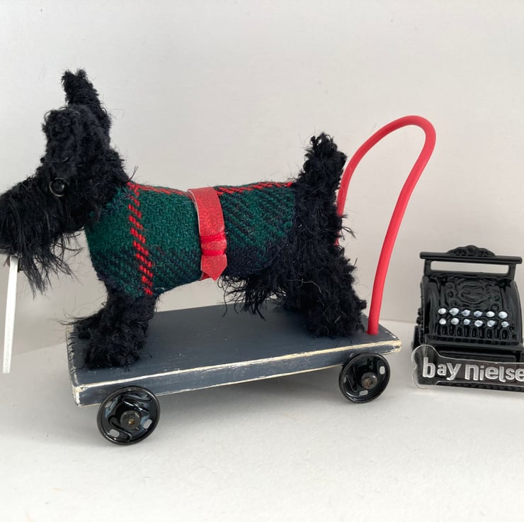 Miniature Scottie on a Push Along Trolley.