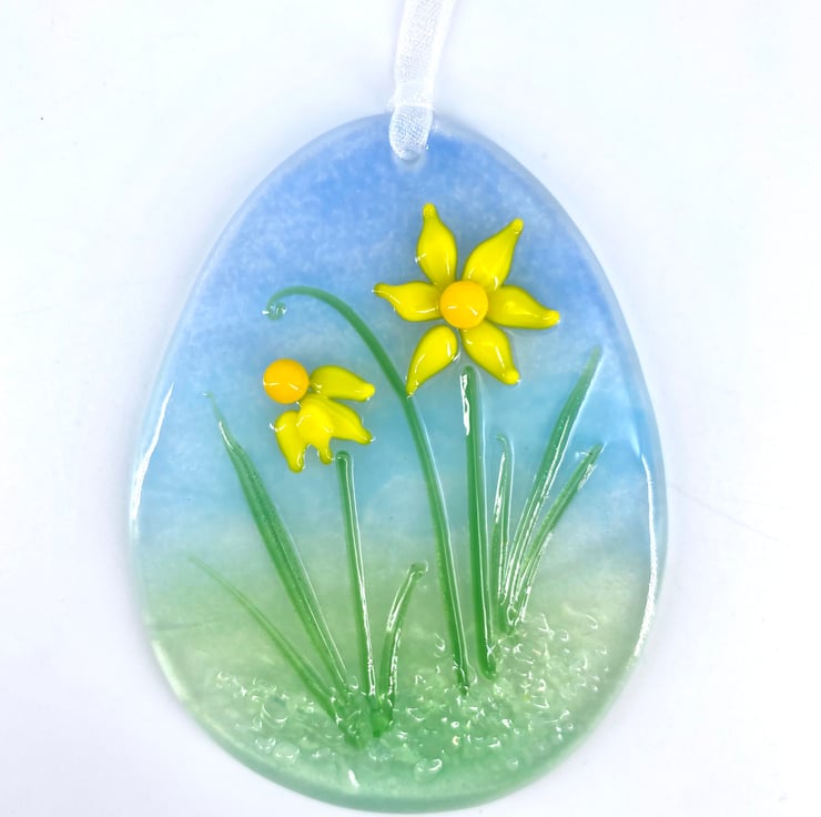 A lovely fused glass egg shaped light catcher with two daffodils. Hung on a piece of organza ribbon it allows the light to travel through - this gives the piece depth and shows off the full beauty of the glass.