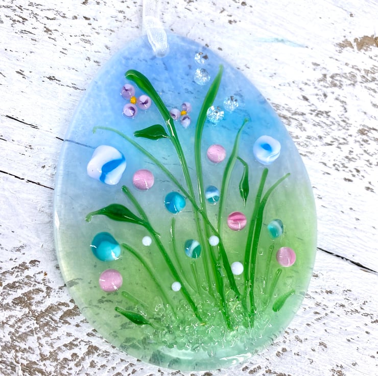 A lovely fused glass egg shaped light catcher with dainty pink & turquoise flowers. Hung on a piece of organza ribbon it allows the light to travel through - this gives the piece depth and shows off the full beauty of the glass.