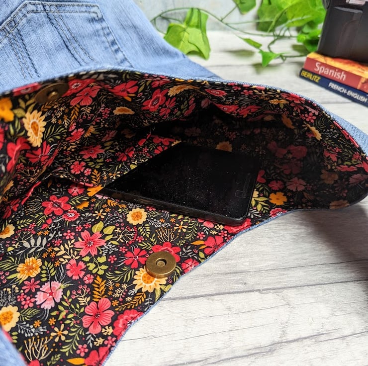 The front of the bag has usable pockets from the jeans and inside, there's a slip pocket divided for phone, pens etc, and a large slip pocket with a snap closure for added security. The front of the bag also has an appliqued leather flower which picks out the colours of the lining. For those of us who lose our keys in the bottom of our bag, there's a swivel lobster clasp secured to the inside of the bag with a grosgrain ribbon. A bronze tone magnetic closure secures the opening of the bag.
