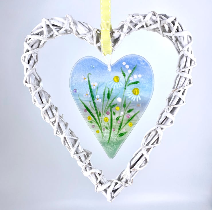 The glass is suspended in the middle of a white wicker heart and piece has been finished with a length of co-ordinating ribbon.