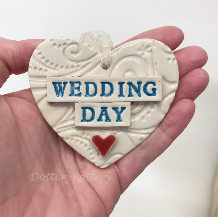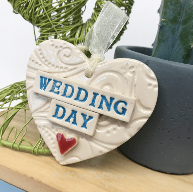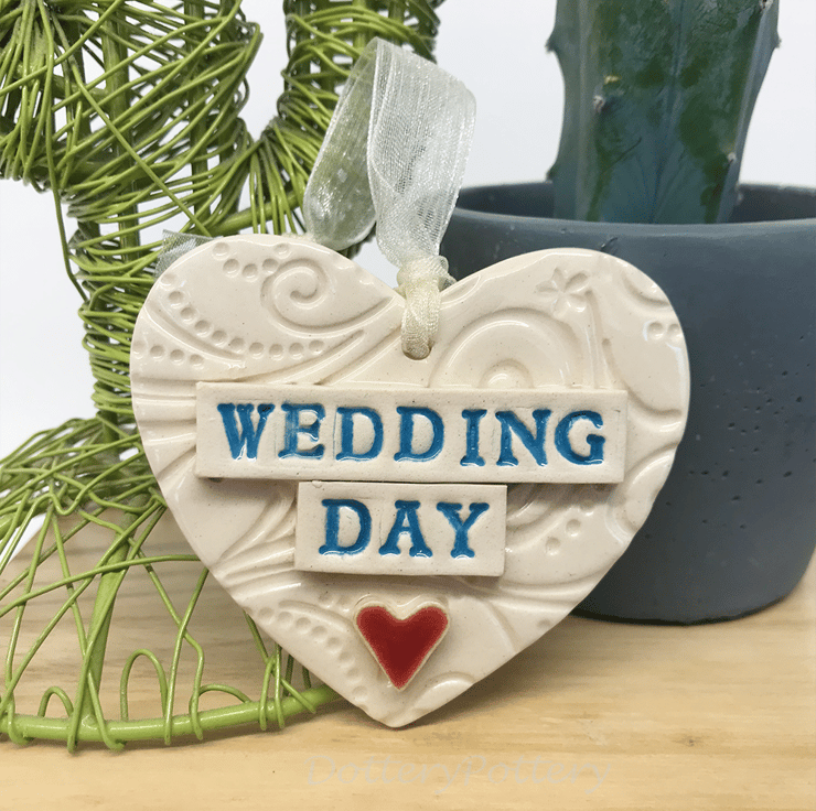 This ceramic heart is made from white earthenware clay. It has a cream swirly background finished off with the words Wedding Day Hangs from a matching cream organza ribbon. 7.5cm wide and the same in height. 5mm thick