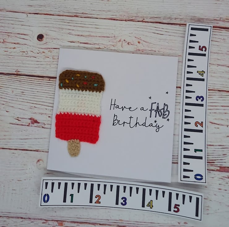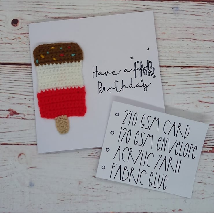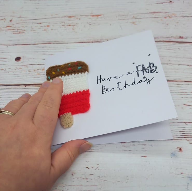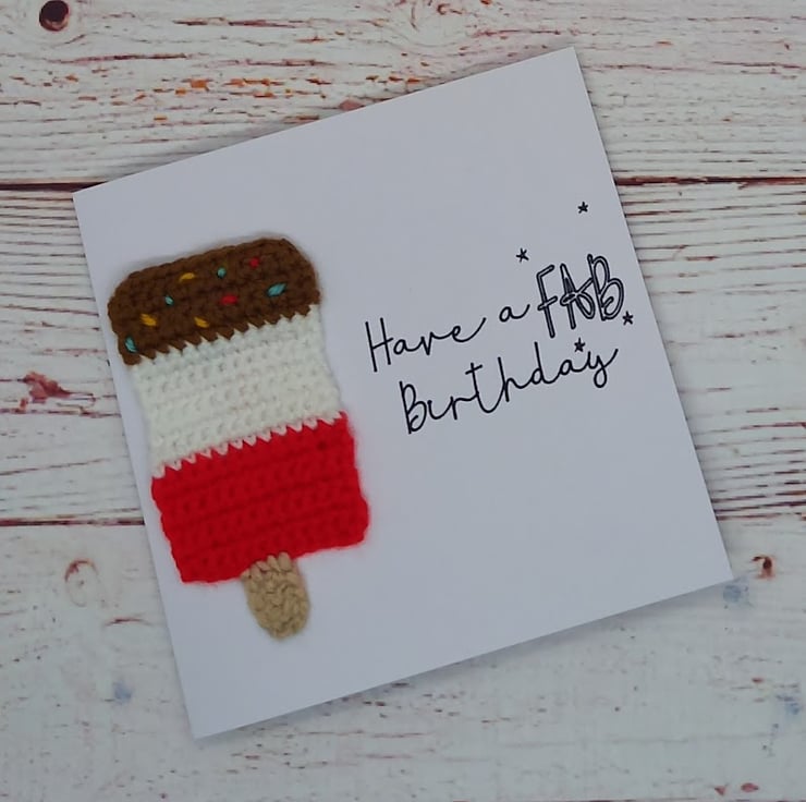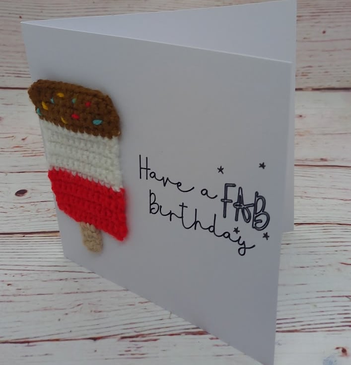 Wish that special someone a FABulous birthday with this delicious handmade card - featuring a crocheted Fab ice Lolly and the words 'Have a Fab Birthday' this card is certain to raise a smile....