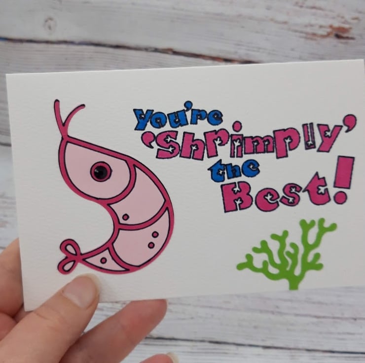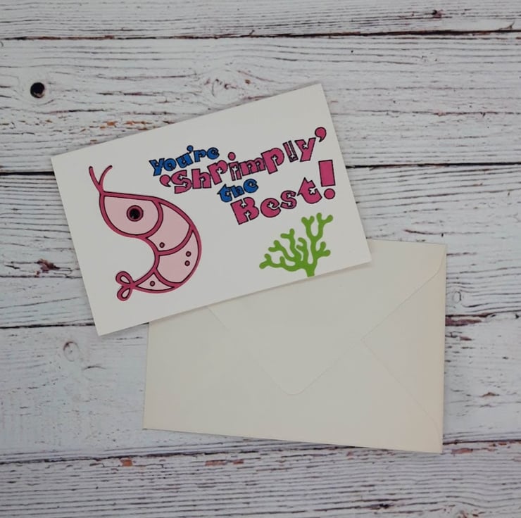 A large pink shrimp cut out from card stock and featured next to the words 'You're Shrimply the Best' this card is certain to make them laugh out loud.