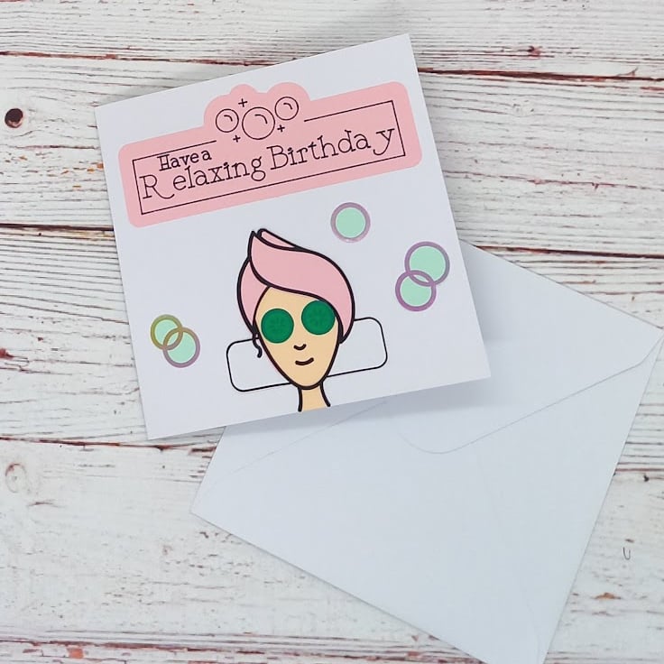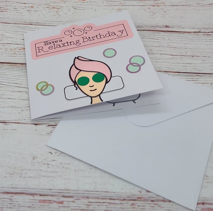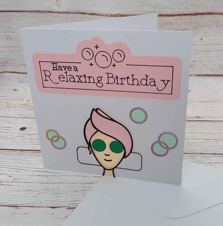 Featuring the sentiment 'Have a relaxing Birthday' it features a woman relaxing at the Spa.
