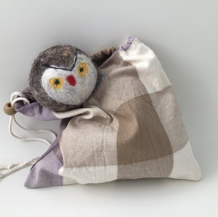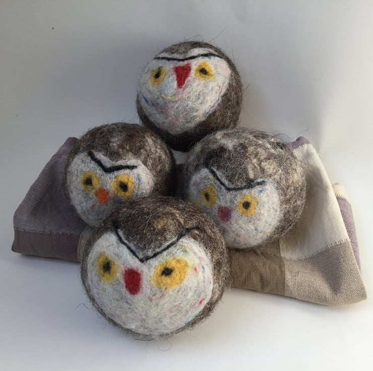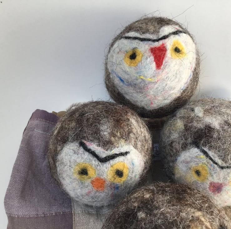 These tumble dryer balls are a great example of how versatile natural products are and how they can be used and reused. These ball have been formed using a combination of wet and needle felting. The main ball is made from the insulated wool packing that protected my husband’s medicine delivery. Once wet felted in the washing machine, it has been decorated with coloured wool. The result is a firm ball, about the size of a tennis ball, which will not unravel and loves being tumble dried. We supply a set of 4 balls in a drawstring bag.