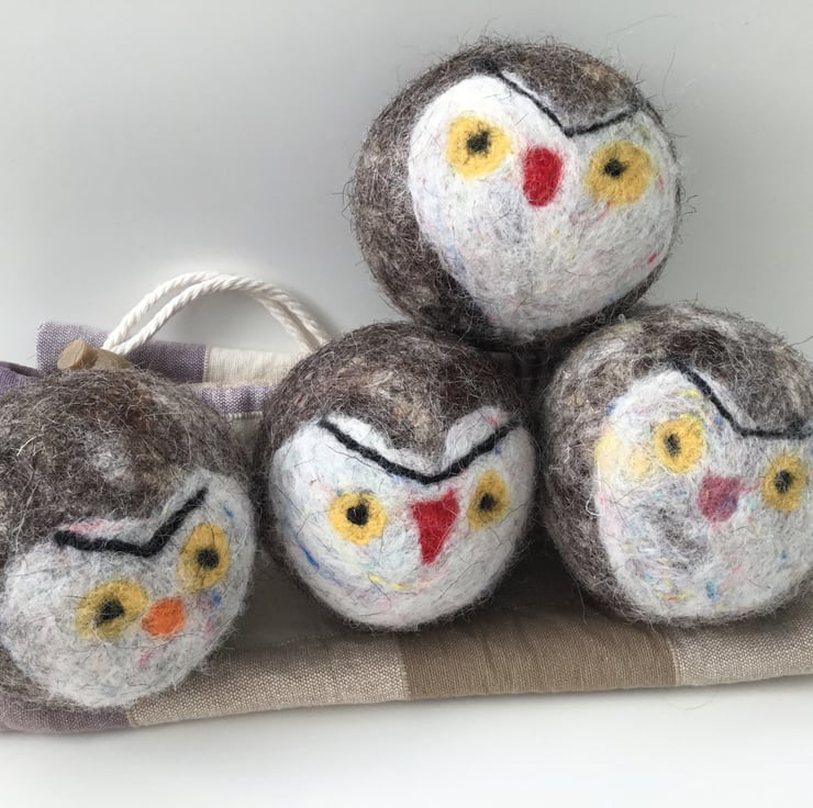 These tumble dryer balls are a great example of how versatile natural products are and how they can be used and reused. These ball have been formed using a combination of wet and needle felting. The main ball is made from the insulated wool packing that protected my husband’s medicine delivery. Once wet felted in the washing machine, it has been decorated with coloured wool. The result is a firm ball, about the size of a tennis ball, which will not unravel and loves being tumble dried. We supply a set of 4 balls in a drawstring bag.