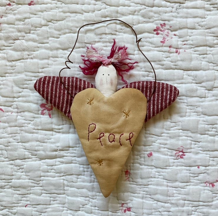 Homespun angel on a rusty tin wire hanger. The padded heart is hand embroidered with stars and ‘peace’. The wings are also padded. Painted features, blush cheeks, and red wavy wool hair finished with a homespun bow.