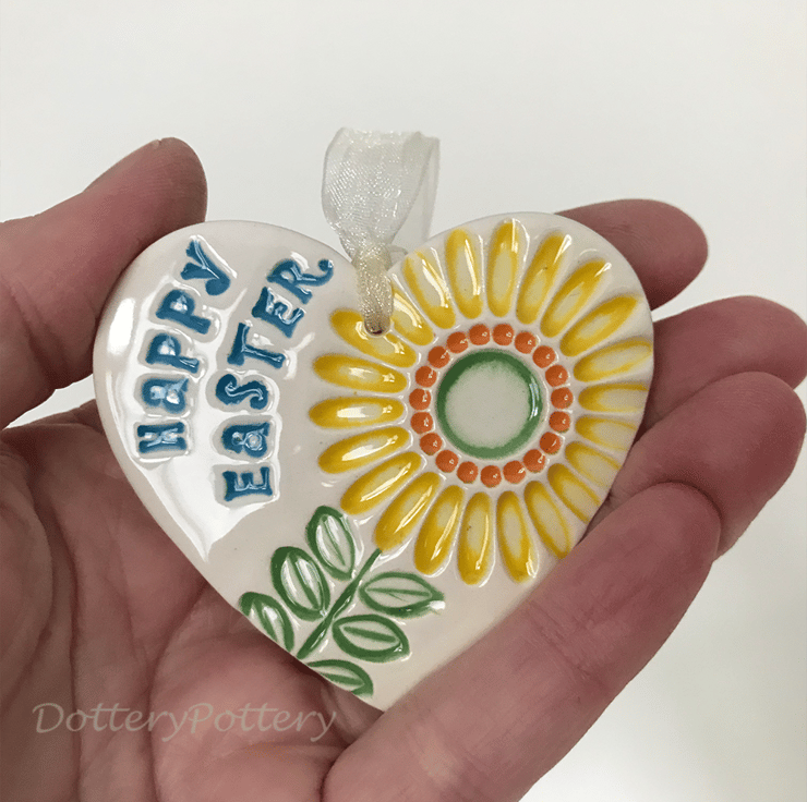 This little heart is made from white earthenware clay and imprinted with a yellow sunflower design.I t has then been fired in an electric pottery kiln, glazed and then fired again. It measures 6 centimetres wide x 5.5cm height x 5mm thick. It can be hung outside.