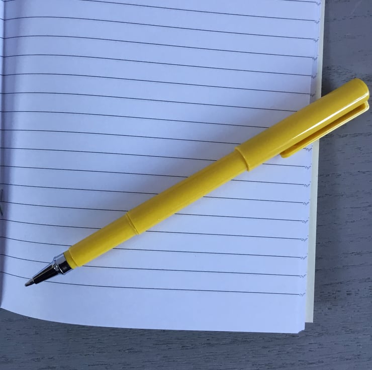 This A5 Notebook (8 by 5.5 inches) has 36 lined pages. A yellow pen, writing in black ink, compliments the hand embroidered front cover...... making a personalised gift set. It’s ready to write in…..notes, lists and plans….