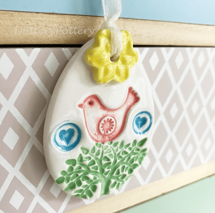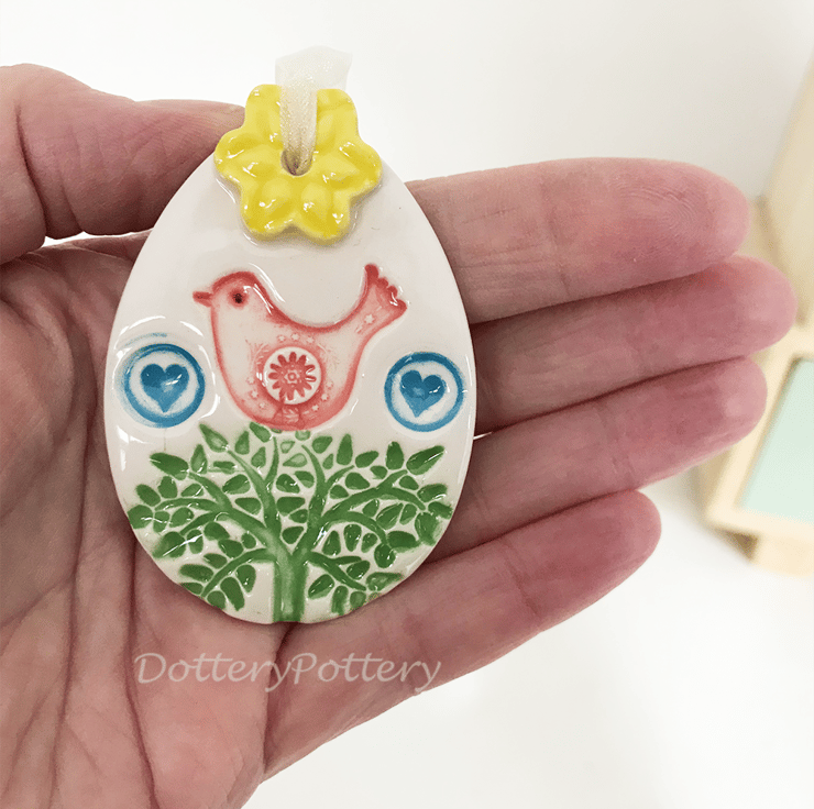 This little ceramic easter egg is made from white earthenware clay and imprinted with pattern.y This has been fired in an electric pottery kiln, so it is nice and strong. It measures 6.5cm x 4.5cm and hangs from a matching cream organza ribbon. It is glazed on the front and left plain on the back.