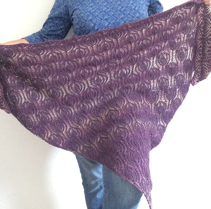 Beautiful 2 coloured reversible lacy triangular shawl knit in 100% wool / silk blend yarns. Original pattern designed by The Feminine Touch Designs
