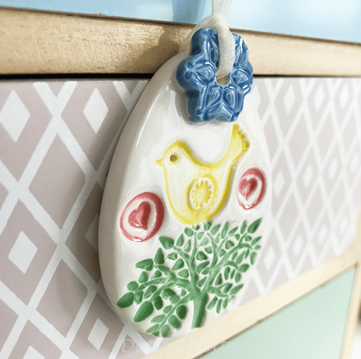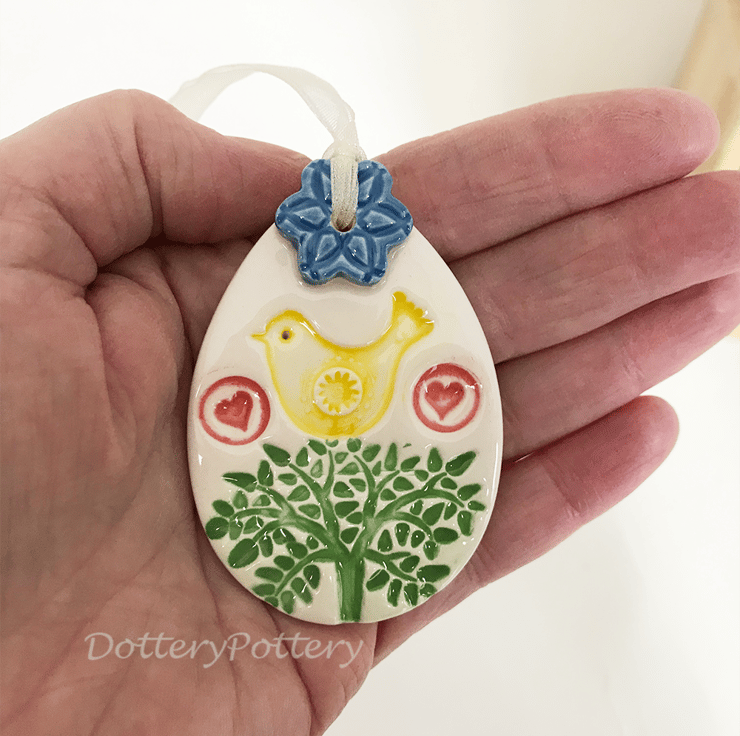This little ceramic easter egg is made from white earthenware clay and imprinted with pattern. This has been fired in an electric pottery kiln, so it is nice and strong. It measures 6.5cm x 4.5cm and hangs from a matching cream organza ribbon. It is glazed on the front and left plain on the back.