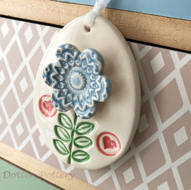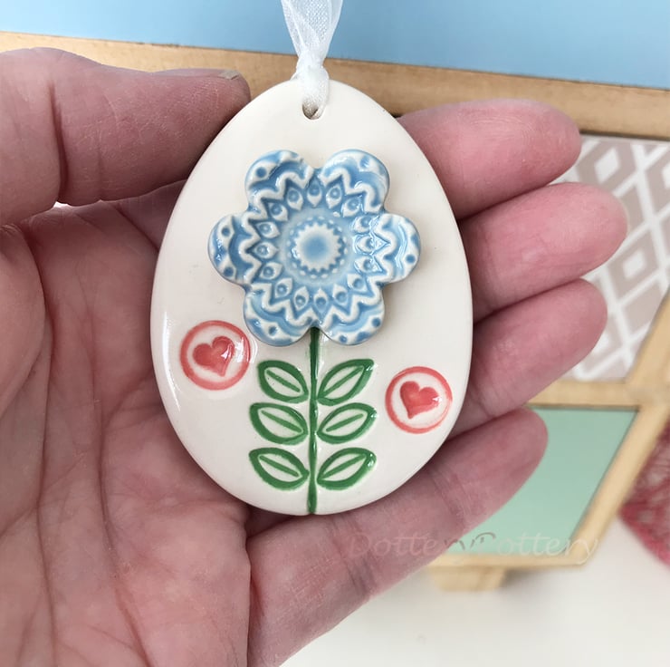 This little ceramic easter egg is made from white earthenware clay and imprinted with pattern. It is topped with a blue flower. This has been fired in an electric pottery kiln, so it is nice and strong. It measures 6.5cm x 4.5cm and hangs from a matching cream organza ribbon. It is glazed on the front and left plain on the back.