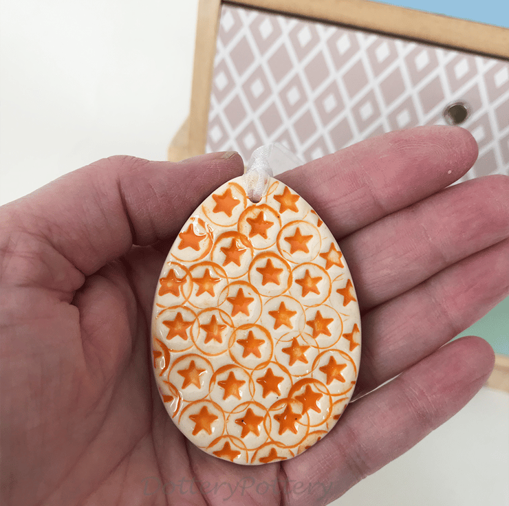 This little ceramic easter egg is made from white earthenware clay and imprinted with a star pattern. This has been fired in an electric pottery kiln, so it is nice and strong. It measures 6.5cm x 4.5cm and hangs from a matching cream organza ribbon. It is glazed on the front and left plain on the back.