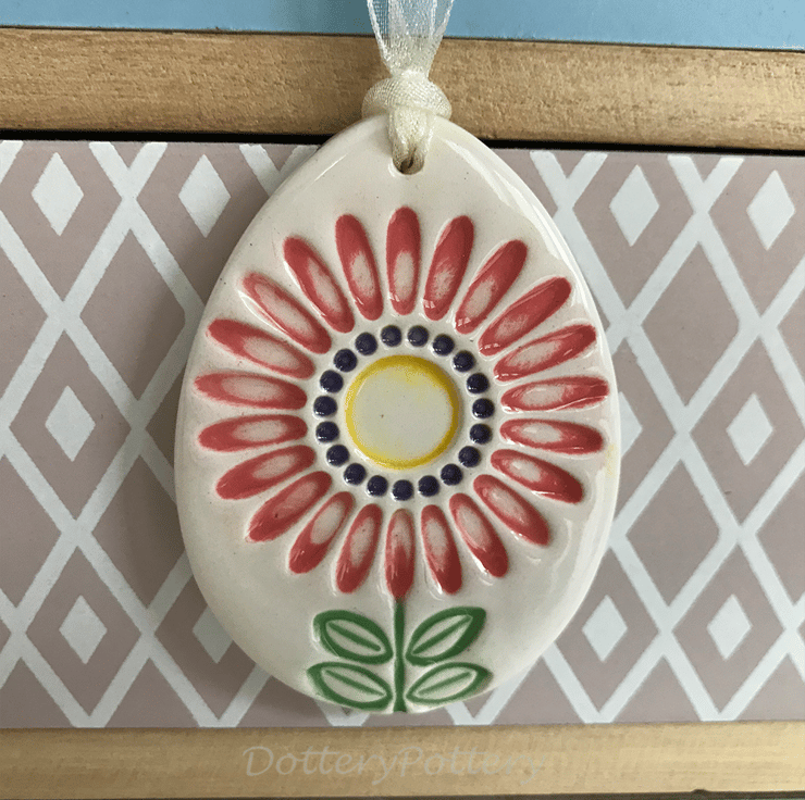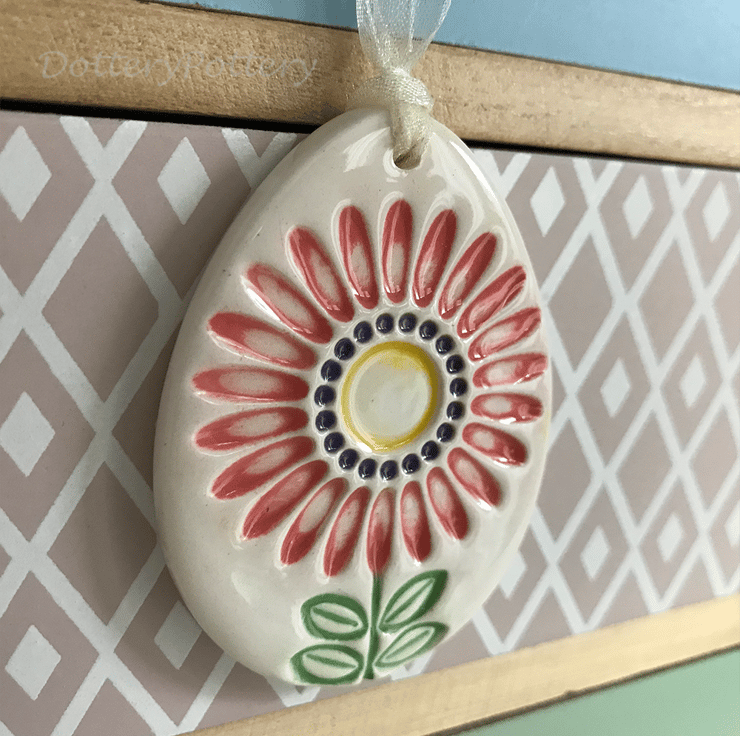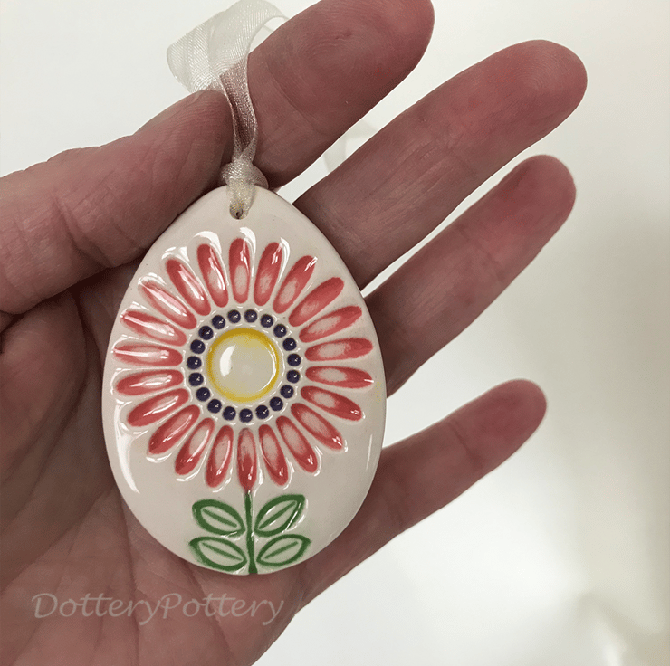 This little ceramic easter egg is made from white earthenware clay and imprinted with a pink flower. This has been fired in an electric pottery kiln, so it is nice and strong. It measures 6.5cm x 4.5cm and hangs from a matching cream organza ribbon. It is glazed on the front and left plain on the back.
