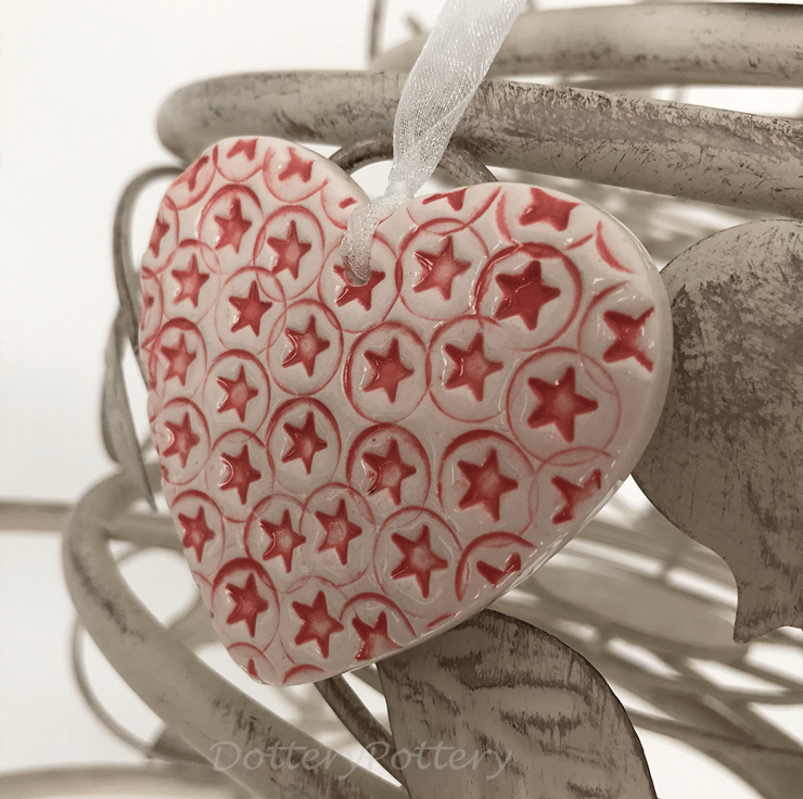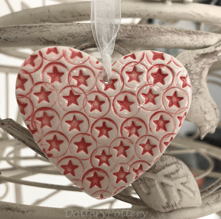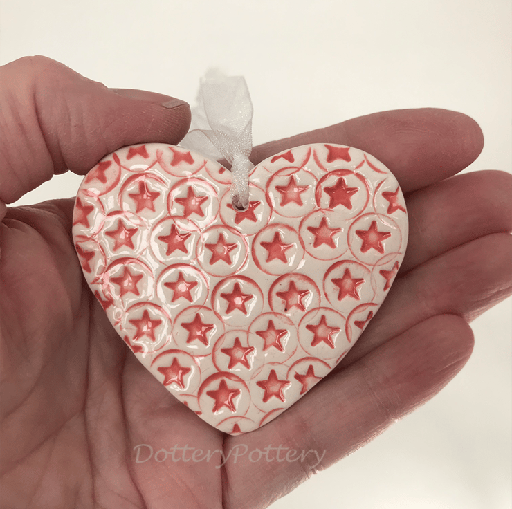 This little heart is made from white earthenware clay and imprinted with a star design.I t has then been fired in an electric pottery kiln, glazed and then fired again. It measures 6 centimetres wide x 5.5cm height x 5mm thick. It can be hung outside.