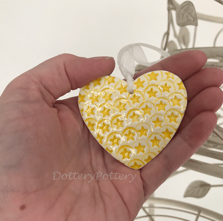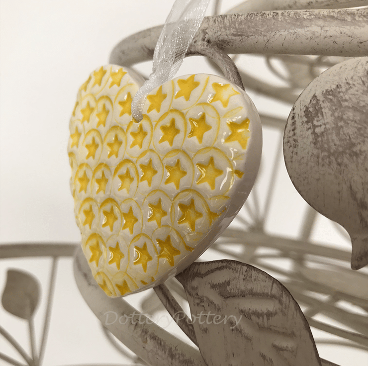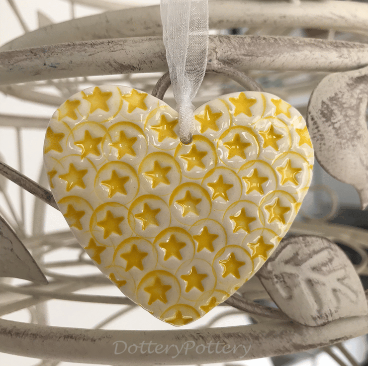 This little heart is made from white earthenware clay and imprinted with a star design.I t has then been fired in an electric pottery kiln, glazed and then fired again. It measures 6 centimetres wide x 5.5cm height x 5mm thick. It can be hung outside.