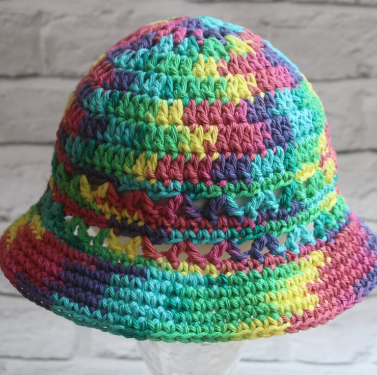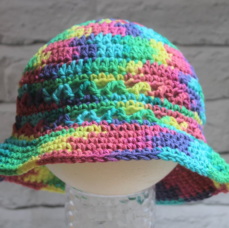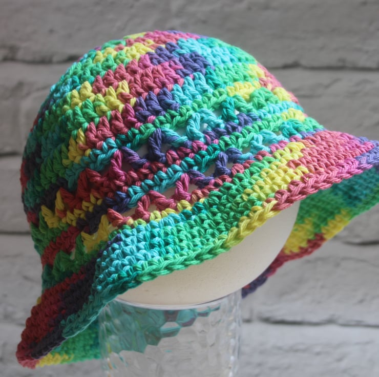 A bright, beautiful and lightweight crocheted cotton sun hat that is perfect for the summer months.