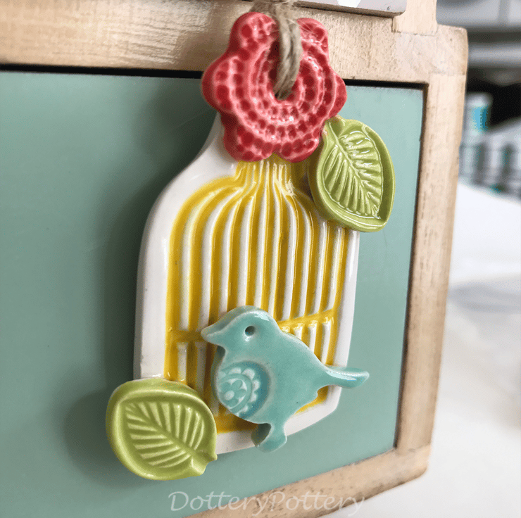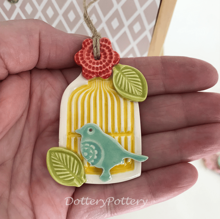 This little ceramic birdcage decoration is made from white earthenware clay and finished with a bird and flower. This has been fired in an electric pottery kiln, so it is nice and strong. It measures 6.m x 4cm and hangs from a brown string. It is glazed on the front and left plain on the back.
