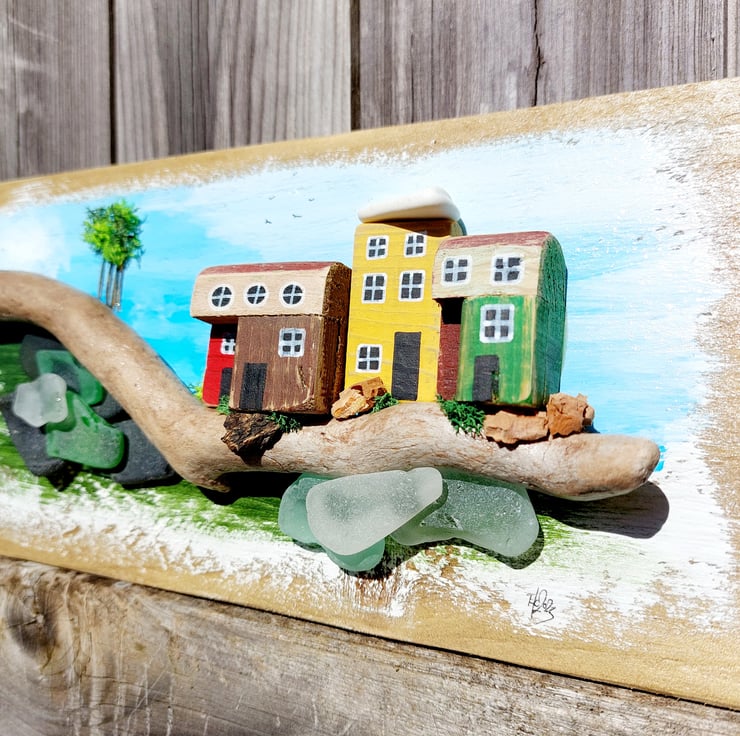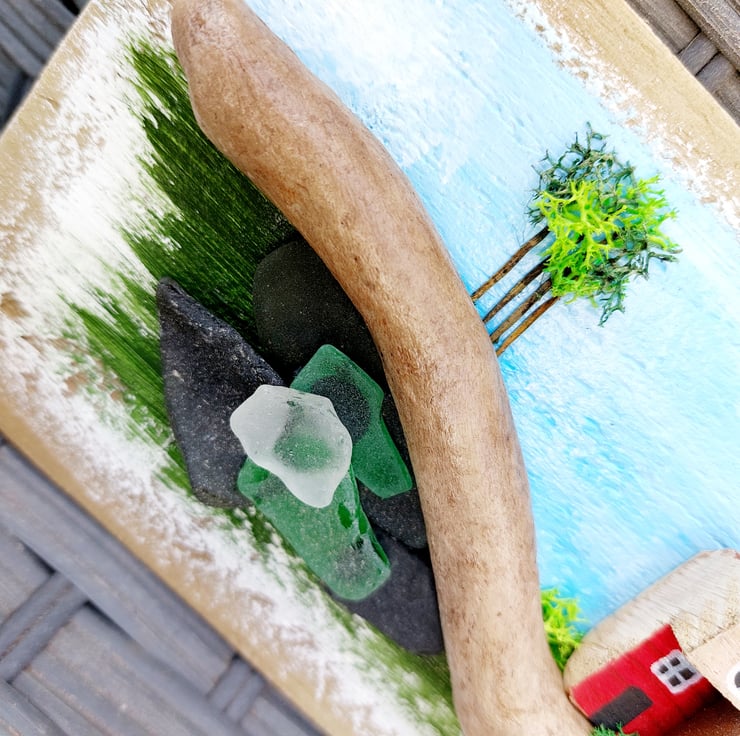 I began making miniature coastal scenes following a beachcombing trip to Morfa Beach in Conwy, north Wales. I was inspired by the colourful coastal cottages and the UK's smallest house that you can visit there. I also found an abundance of lovely chunky sea glass and pottery on the beach which I used in my early pieces, I have really enjoyed making them ever since that visit.